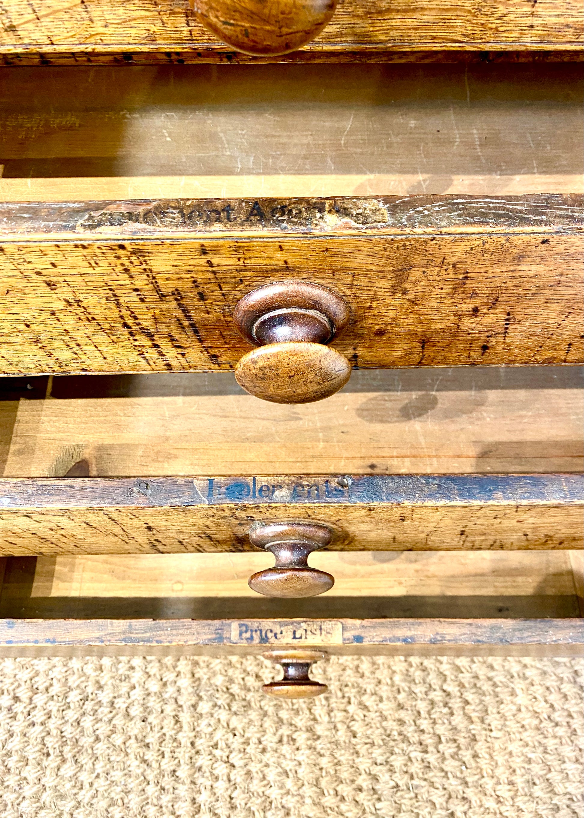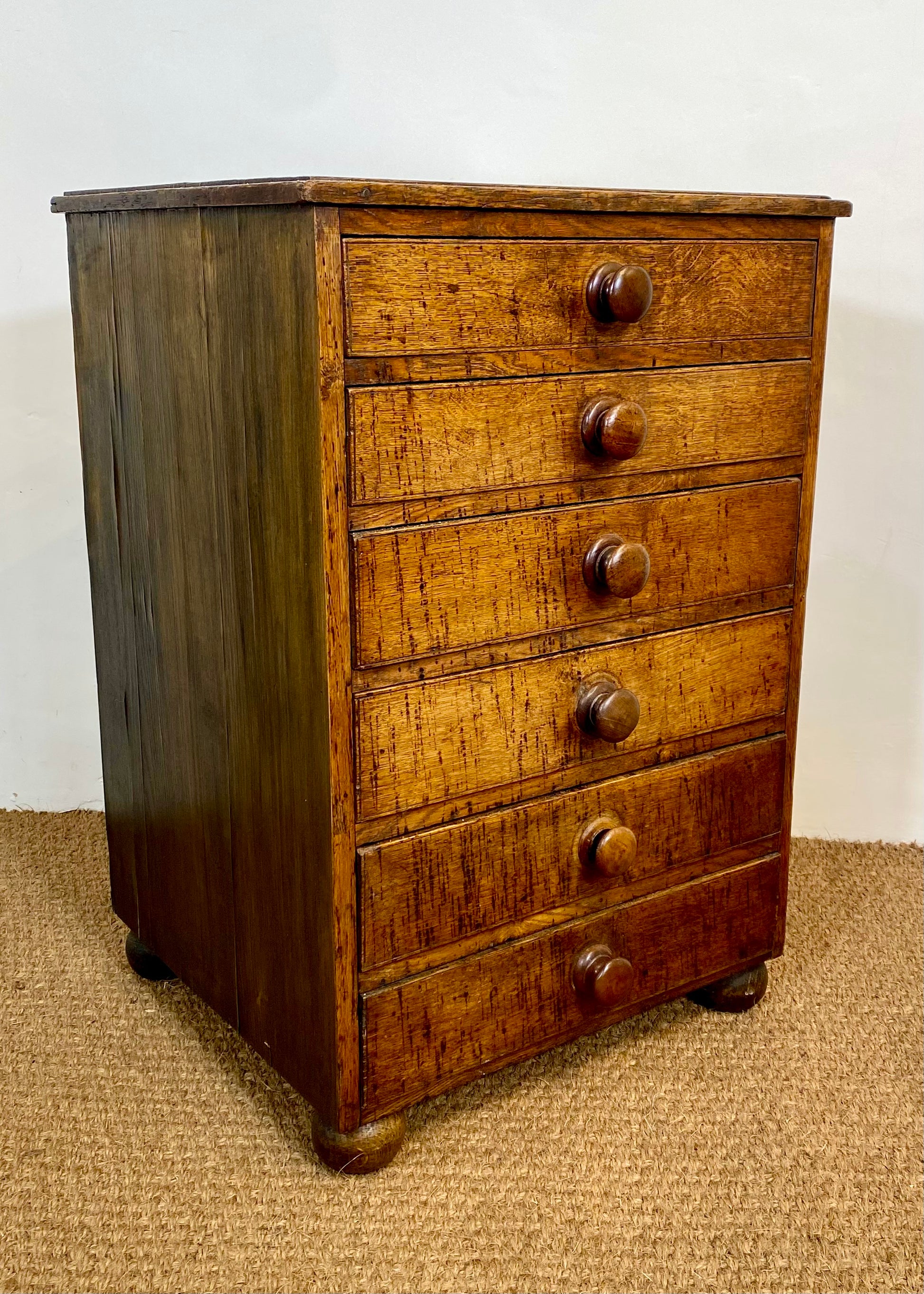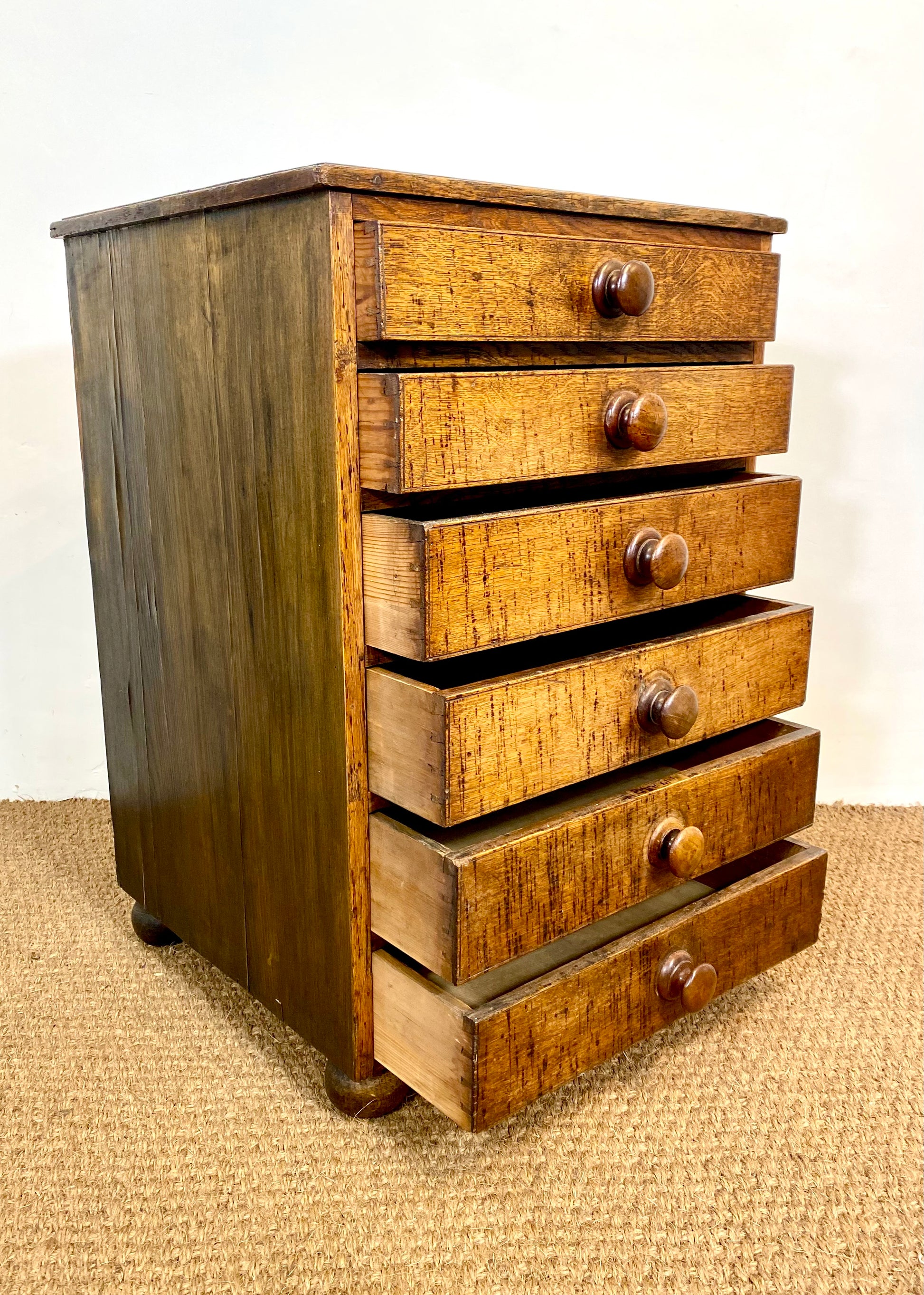 A set of 6 oak office drawers of small proportions. With lovely turned handles and bun feet.