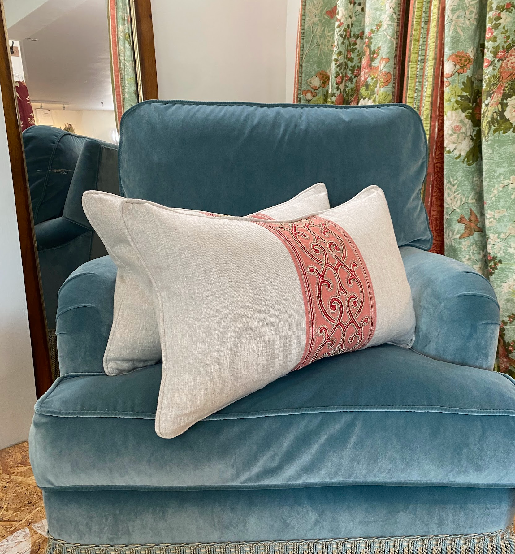 A Professionally made rectangular piped cushion in neutral with pink "Aragon" braid by Colefax and Fowler and feather interior.