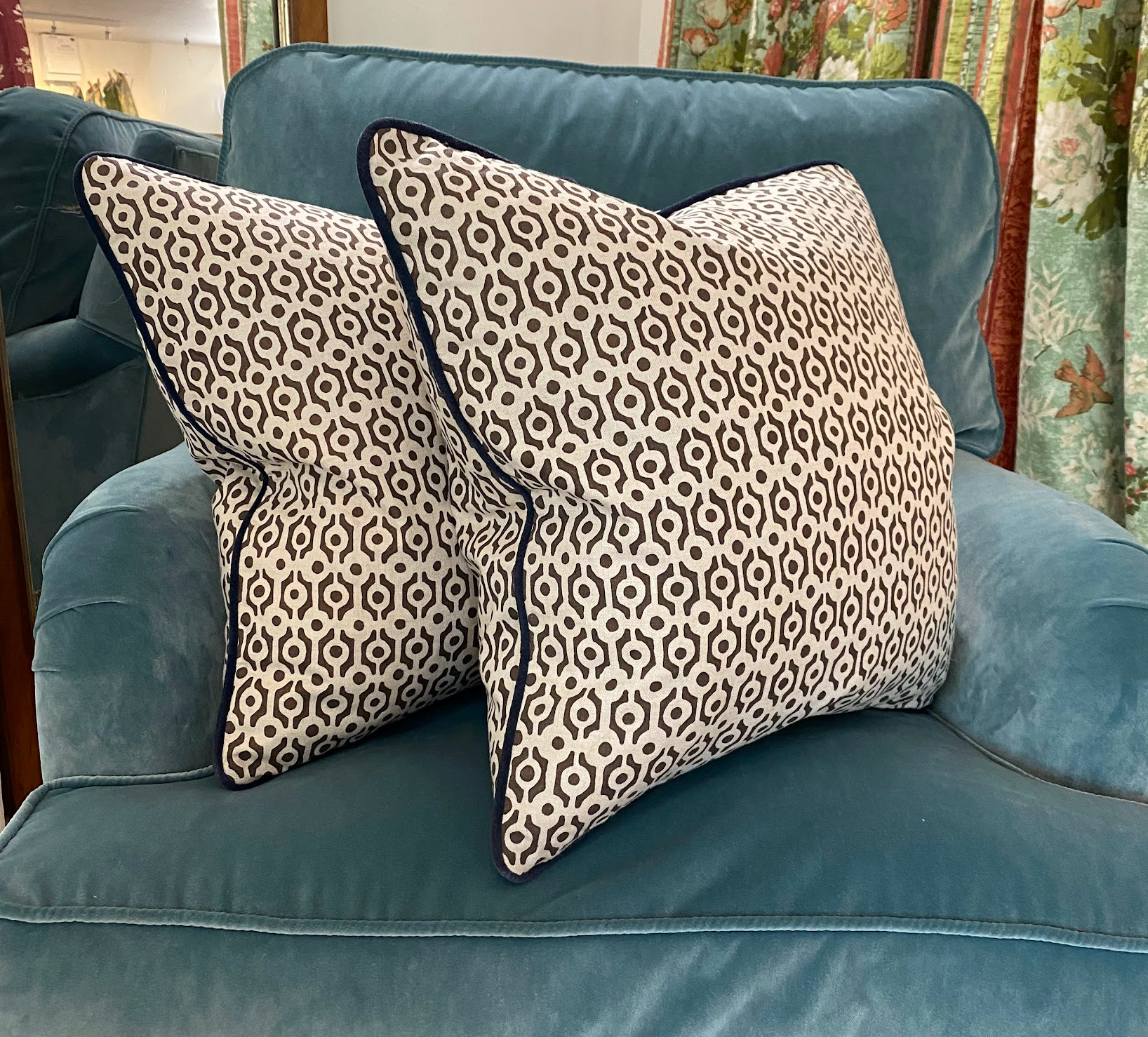 Square piped cushion in "Links" by Galbraith and Paul with a feather interior.