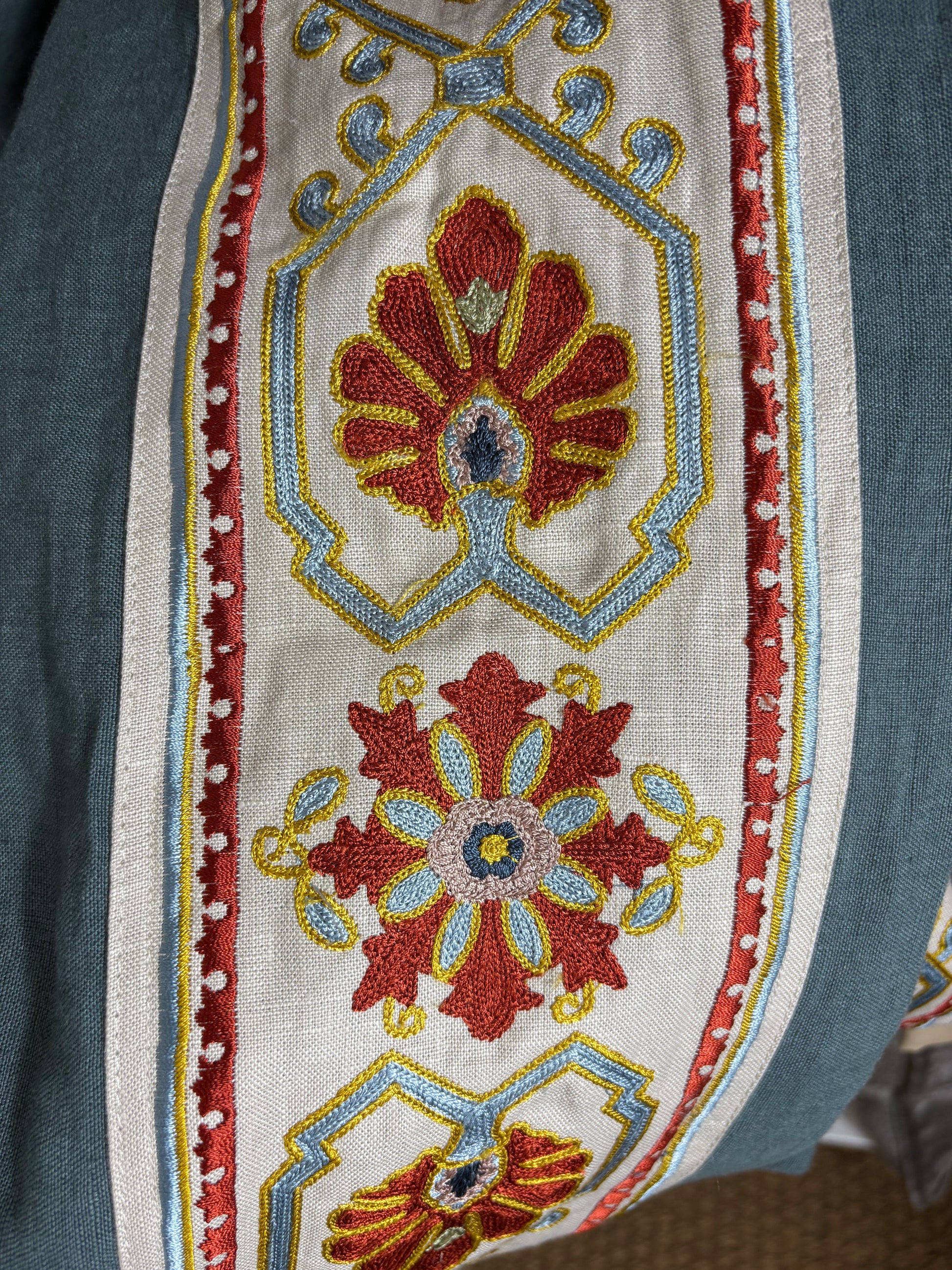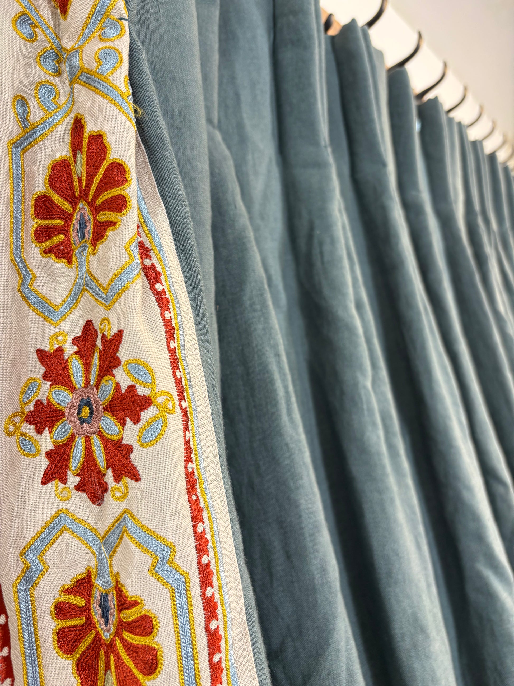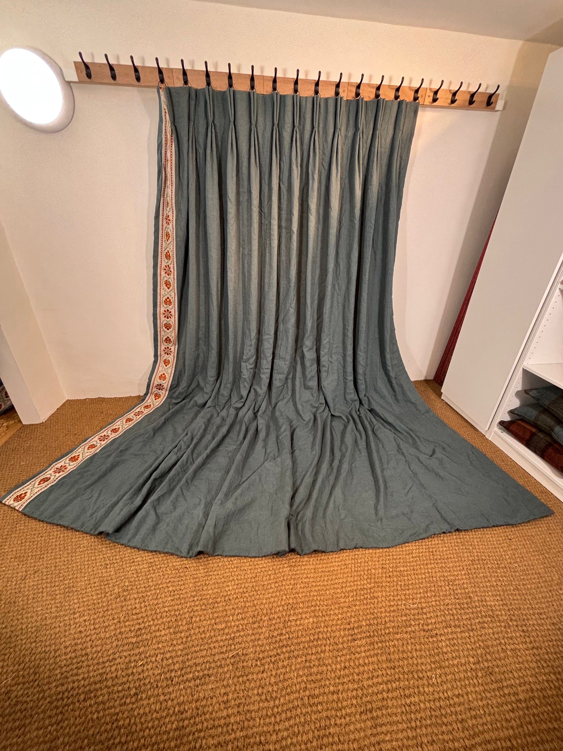 A beautiful pair of large, professionally made lined and interlined curtains in a beautiful soft teal with a decorative braid border by Colefax & Fowler.