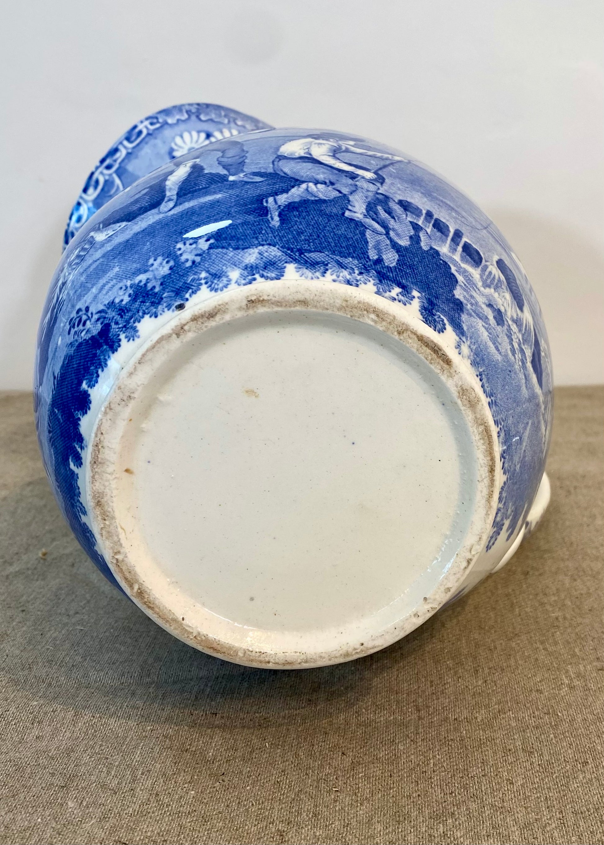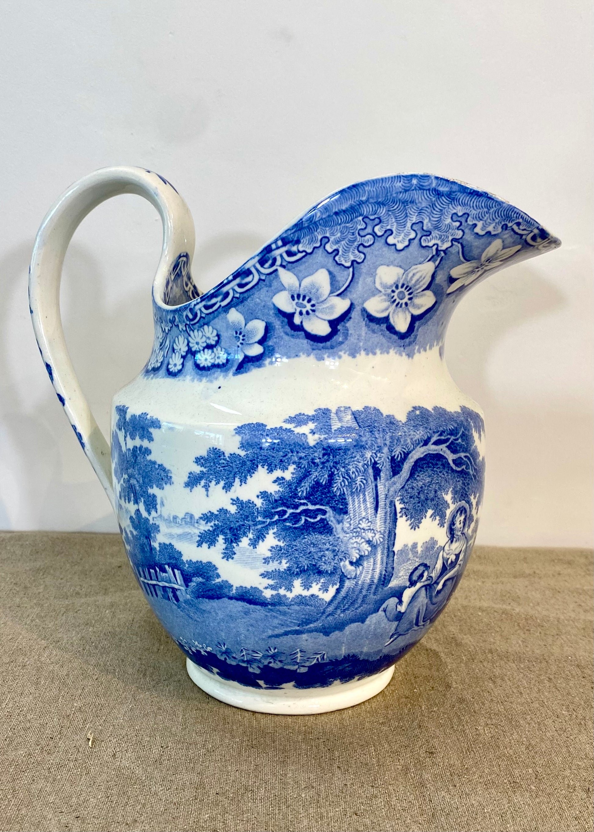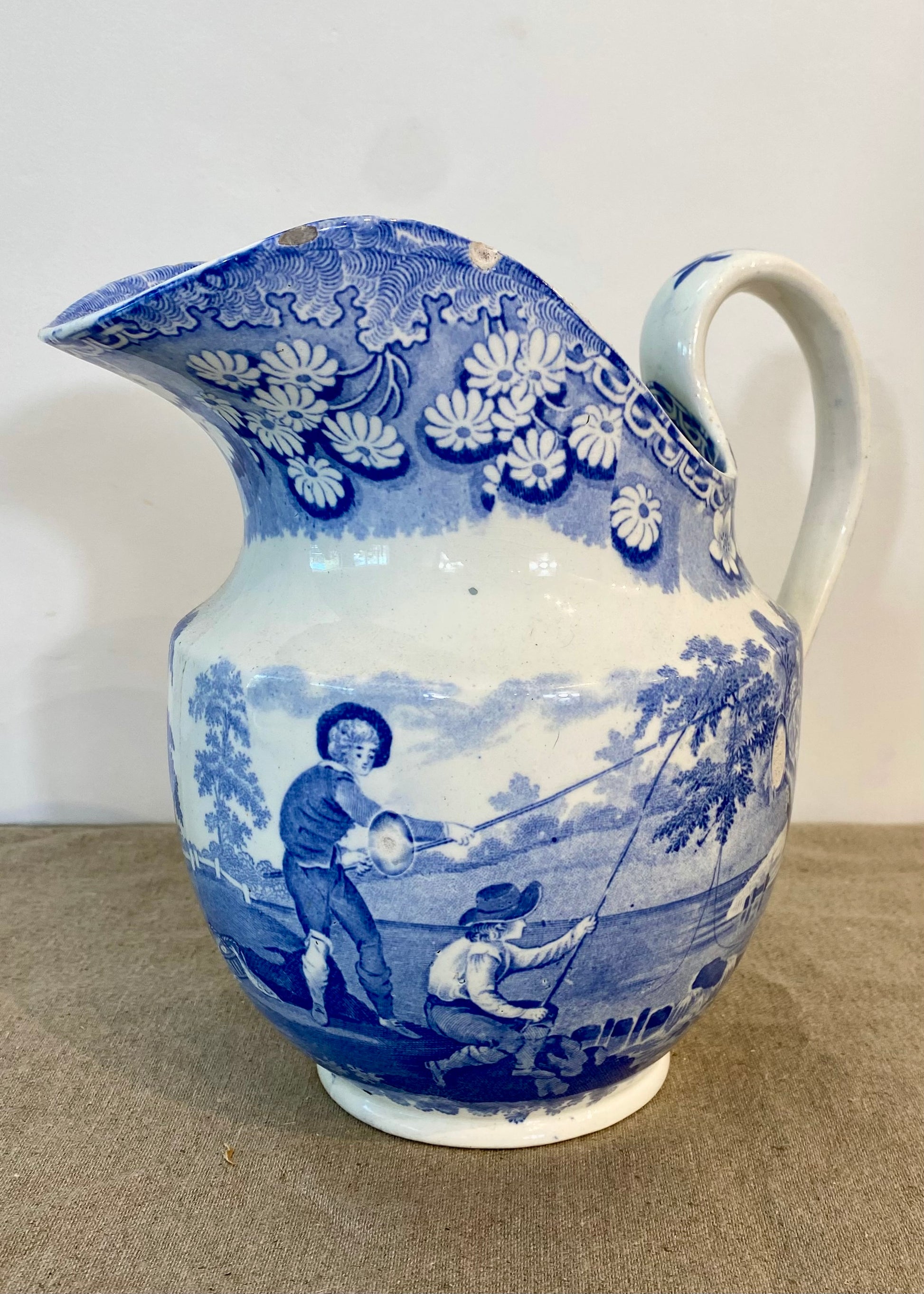 Large blue and white jug with transfer printing of a mother and child along with boys fishing.
