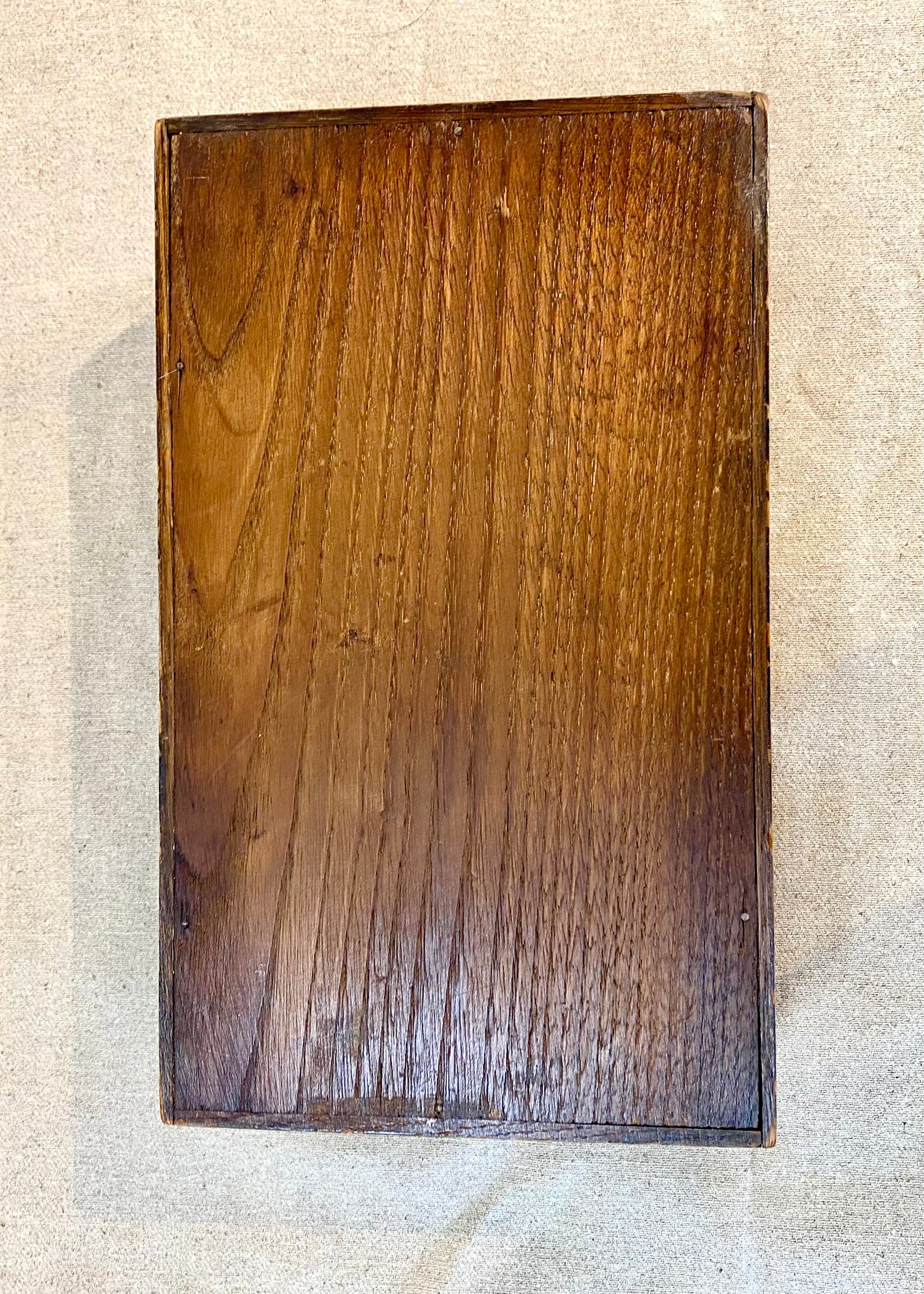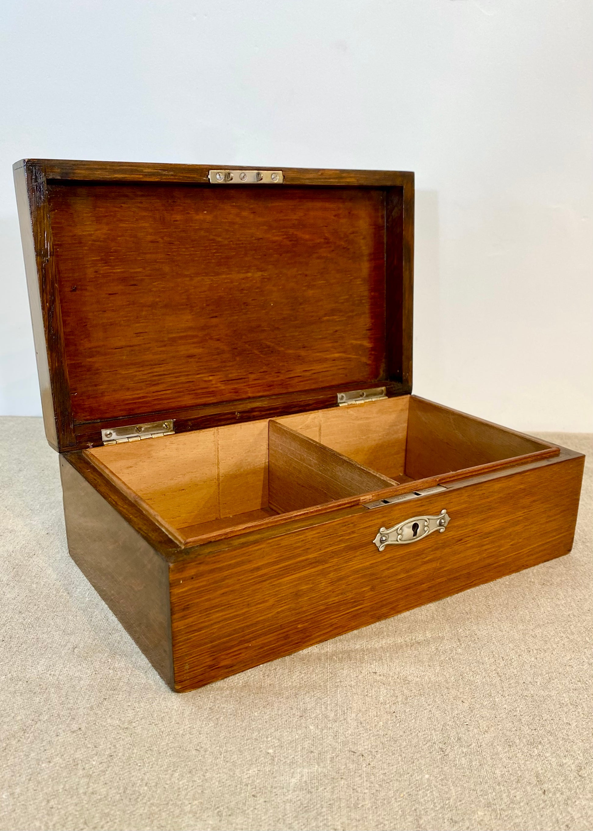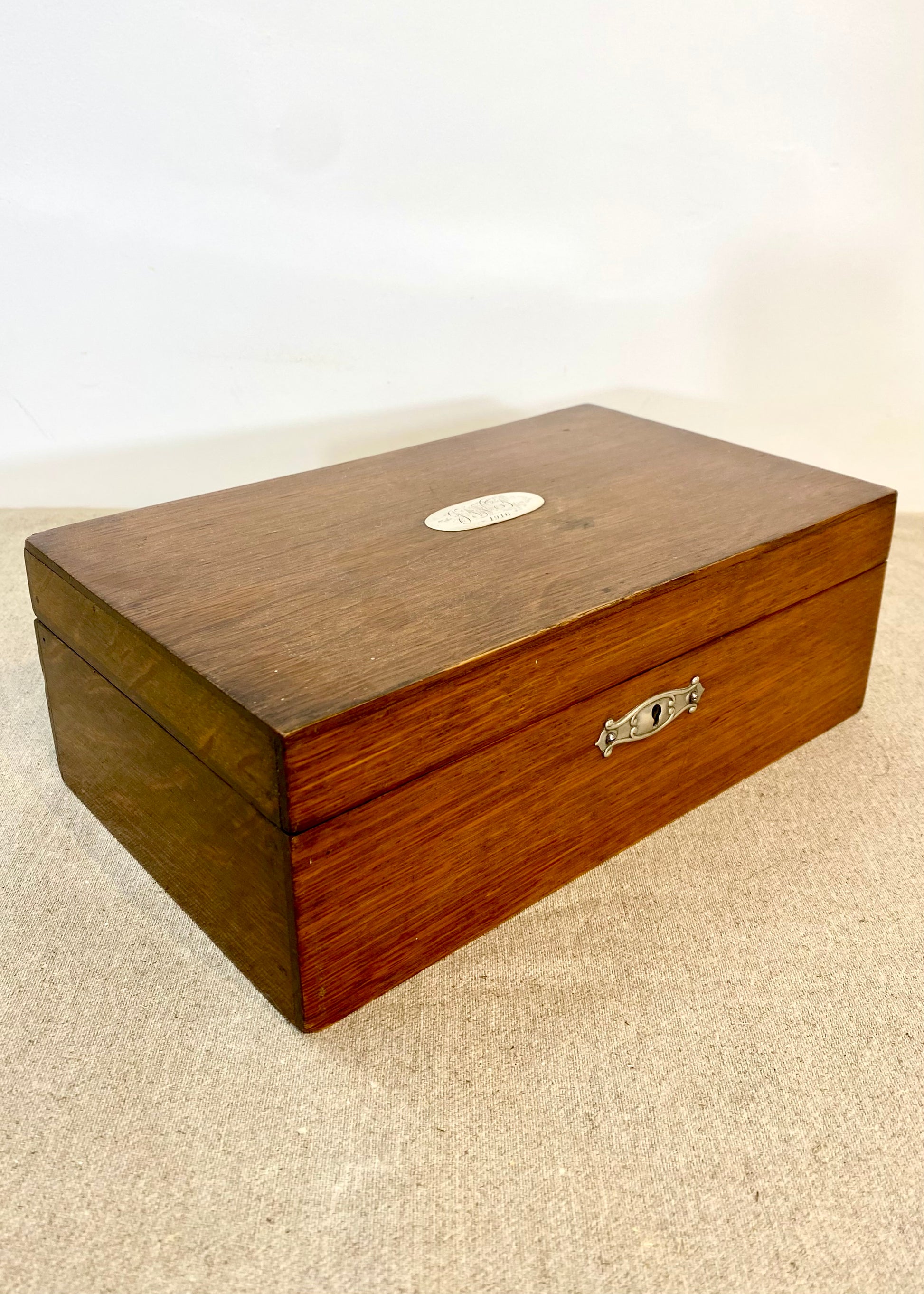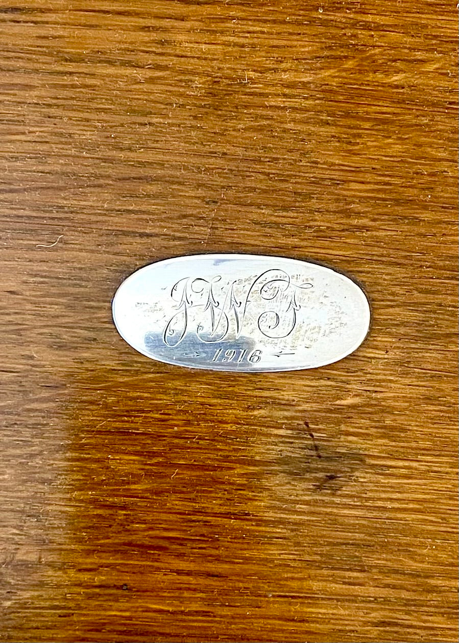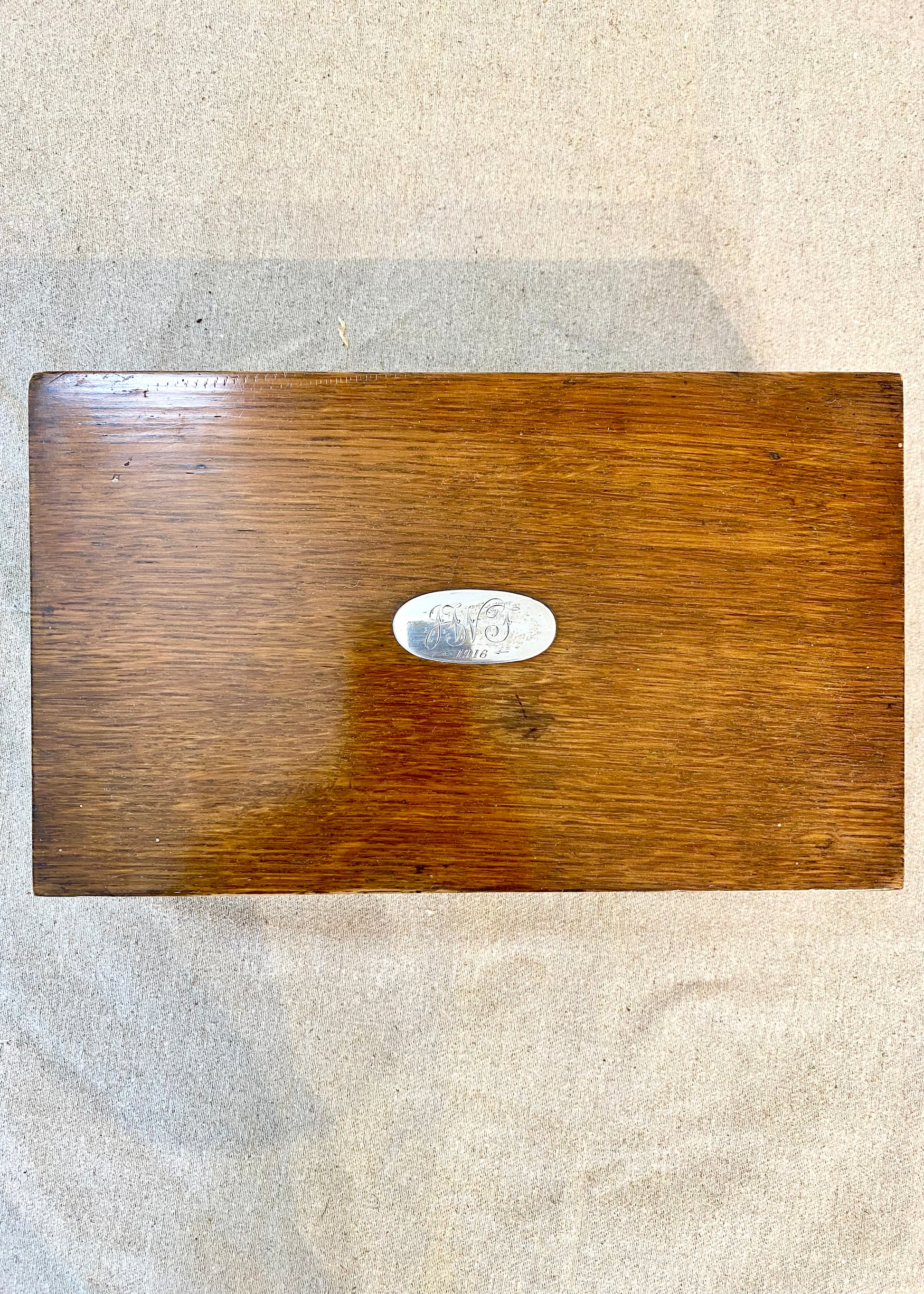 Delightful early 20th Century small oak box with a white metal plaque dated 1916 with letter JWF (?)