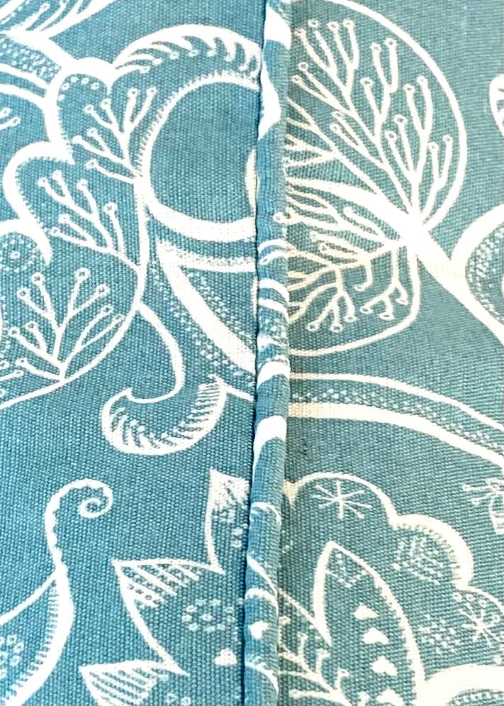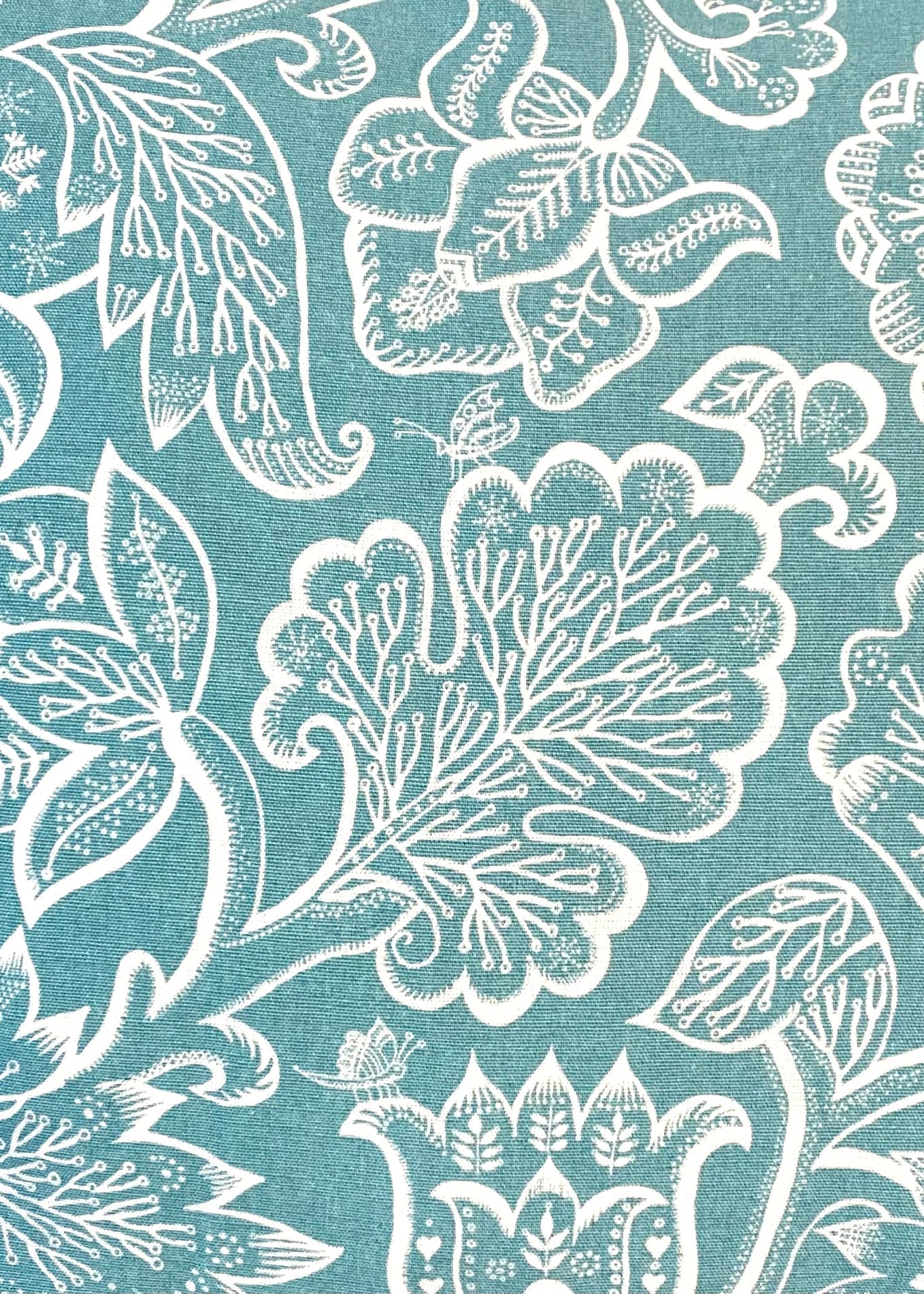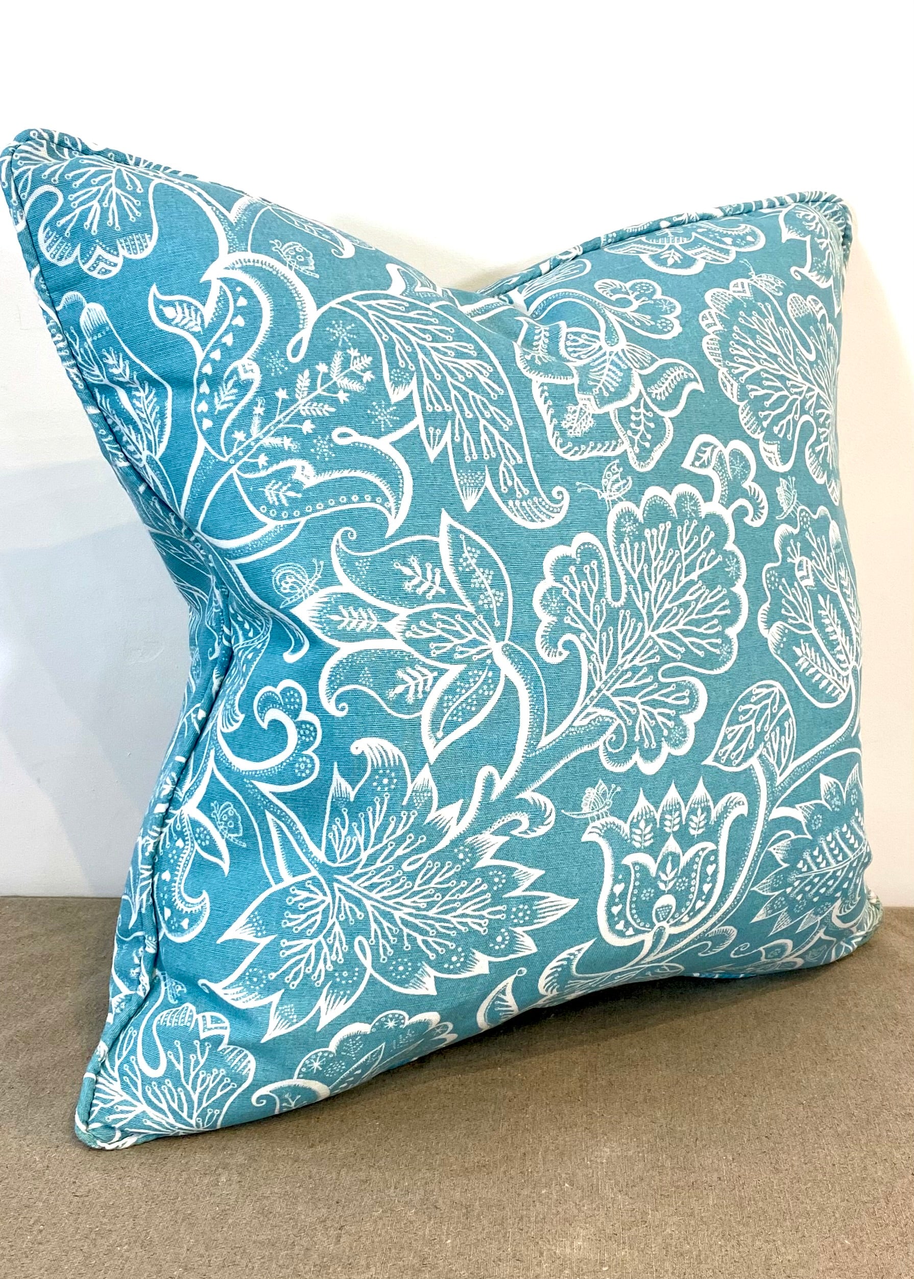 Professionally made in Suffolk - Aqua Botanical Print Piped Cushion with feather interior.